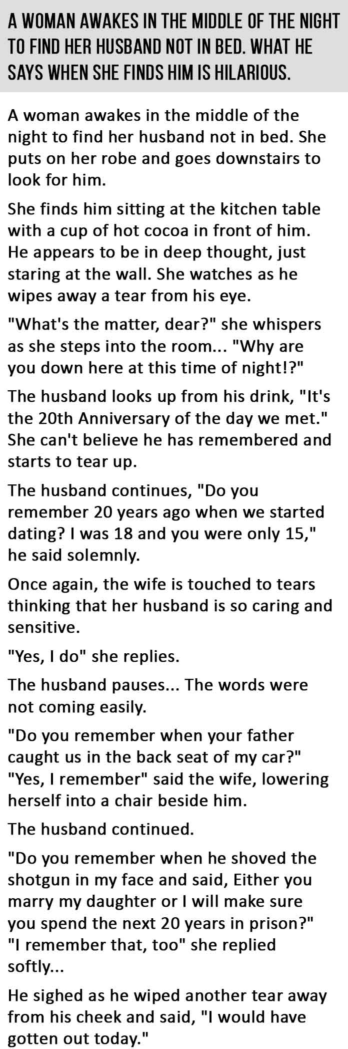 A Woman Awakes In The Middle Of The Night To Find Her Husband Not In Bed. Posted on November 23, 2014 by Bear A Woman Awakes In The Middle Of The Night To Find Her Husband Not In Bed.What He Says When She Finds Him Is Hilarious ” I would have gotten out today” Related Comments